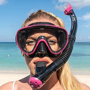 The Seavenger Diving Dry Top Snorkel Set is a solid choice for casual snorkelers and families, including kids, since it offers sizes starting from XXS. The mask features a single tempered glass lens, which provides a wide, clear view and is resistant to scratches from sand — a nice plus for maintaining good visibility. Its fit with a split strap helps keep the mask comfortable and secure during use. The snorkel includes a dry top splash guard and a purge valve, which are practical features to help keep water out and make clearing the snorkel easier, especially for beginners.
