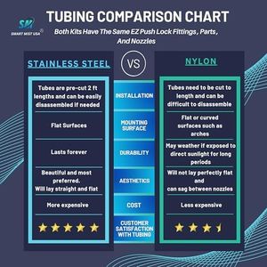 One standout feature is the remote control via a smartphone app, allowing you to customize misting schedules and intervals easily, a capability not common in many other misting kits. The system is designed for easy DIY installation, so professional help is usually unnecessary. Since it uses a high-pressure pump and many nozzles, water usage might be relatively high if used extensively, which should be considered if water conservation is important. Additionally, stainless steel tubing, while durable, can be heavier and potentially more expensive than plastic alternatives.